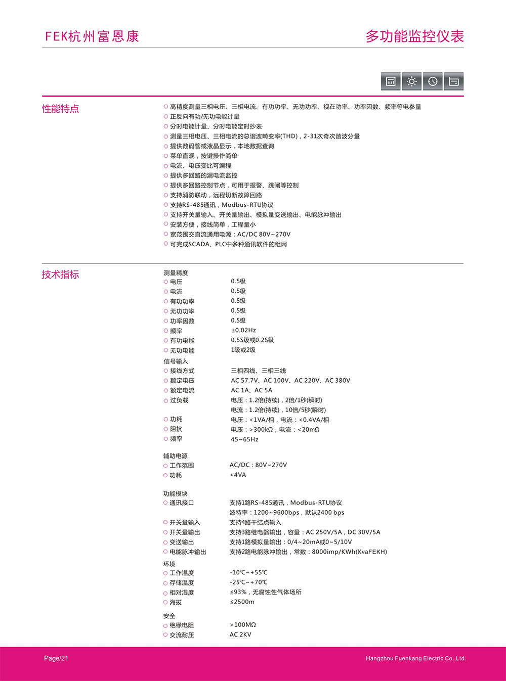 多功能监控仪表是高性能的监控仪表,具有高精度电力参数实时测量、谐波测量、正反向有功/无功电能计量、分时电能计量、分时电能定时抄表、电力品质分析、实时波形显示、事件记录、需量等功能,并配置丰富的输入输出接口可用于现场设备状态的监测与控制,还集成了RS-485通讯接口,可与各种智能配电系统和能量管理系统集成,共享丰富的监测数据和电能质量数据。多功能监控仪表有着极高的性价比,可以直接取代常规电力变送器、测量仪表、电能计量表以及相关的辅助单元,应用领域非常广泛,如能源管理系统、电力监控系统、工矿企业、公共设施、智能建筑和开关柜等配电网络系统。